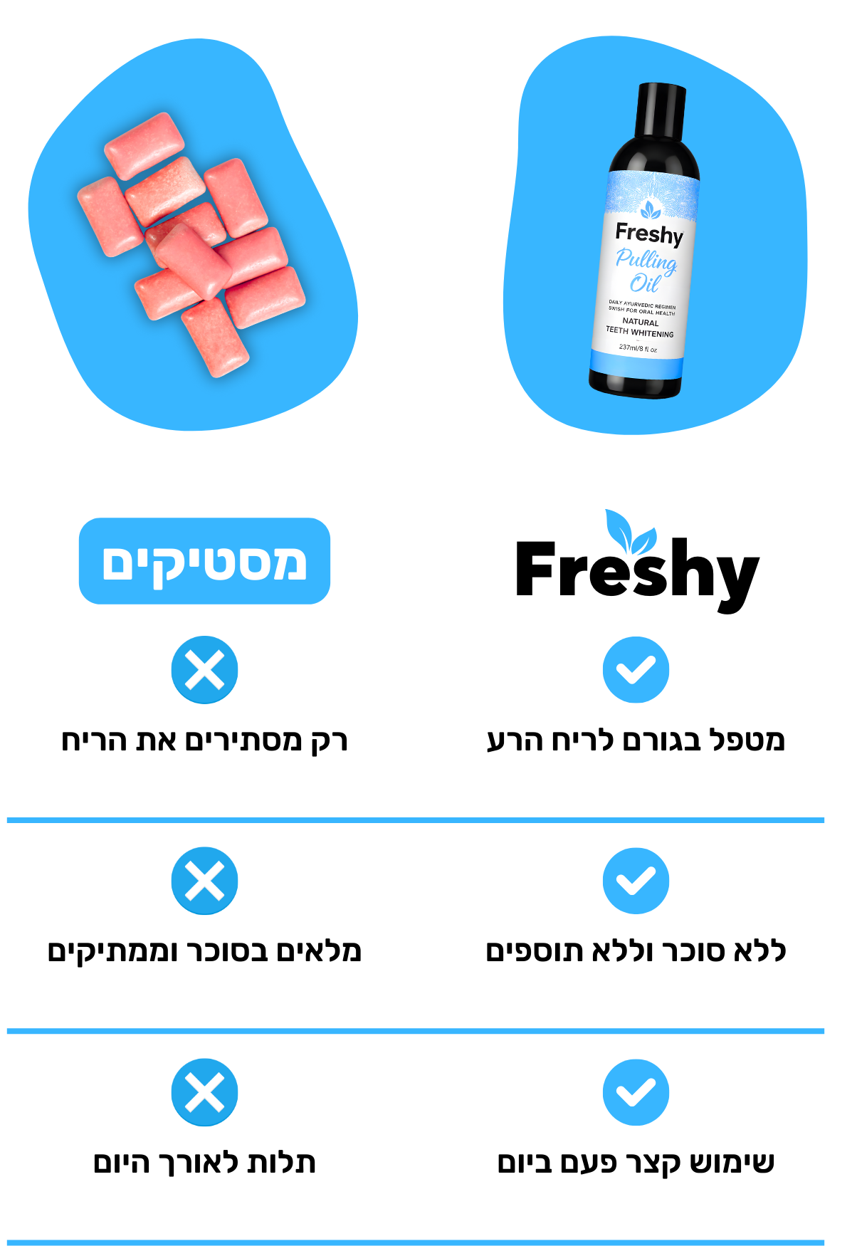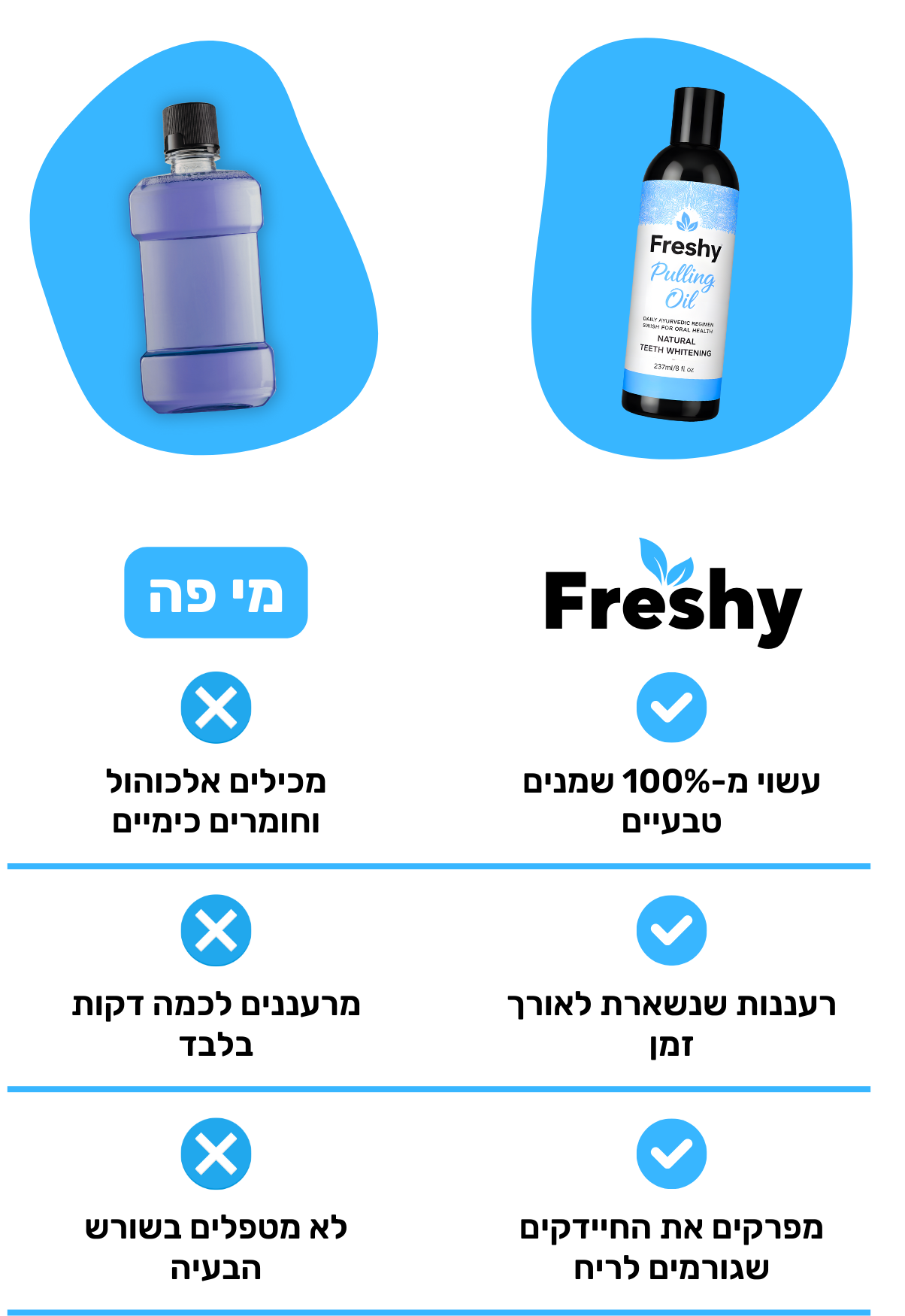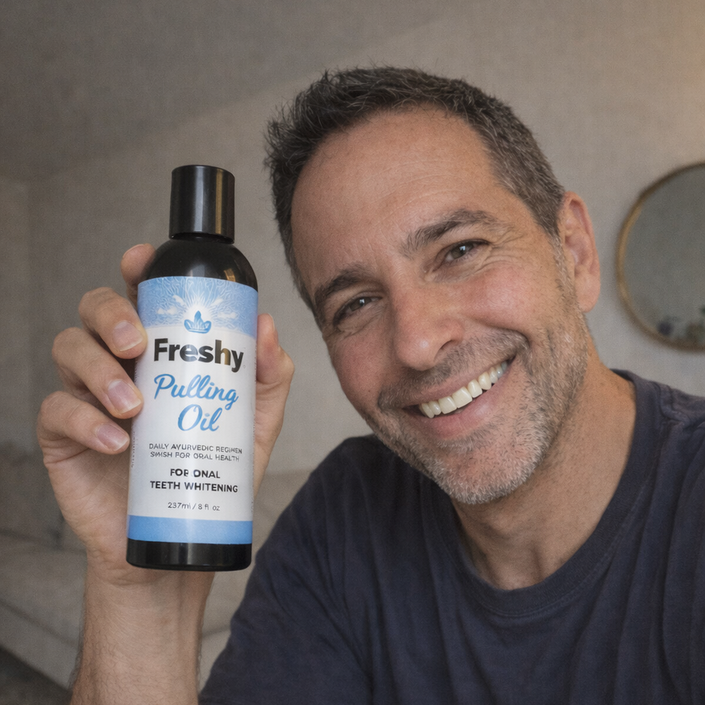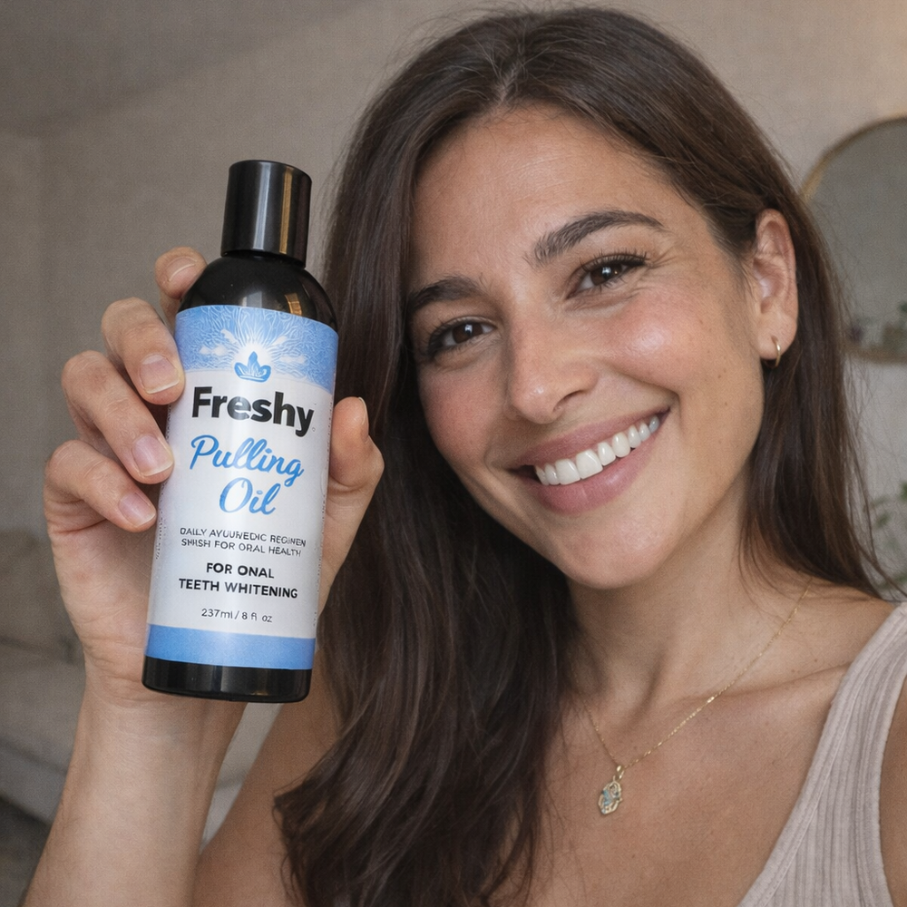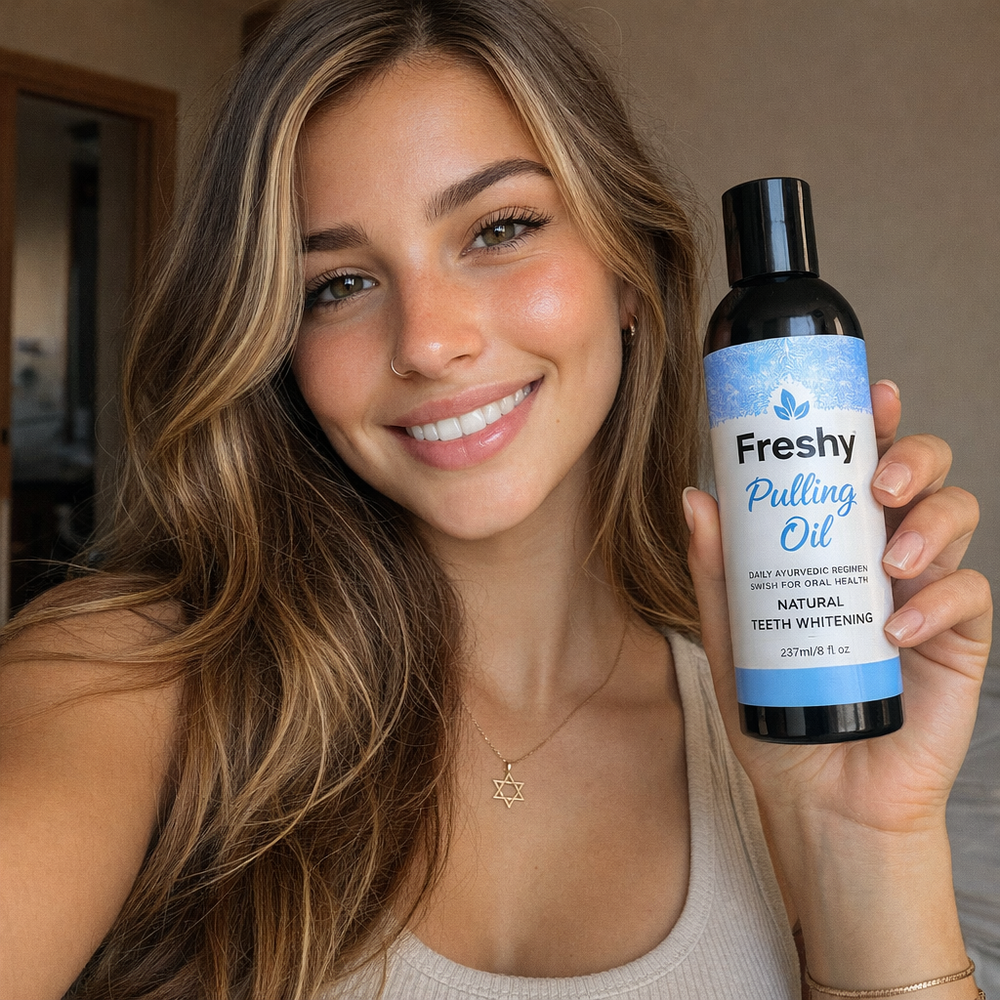 • שמן לניקוי הפה של Freshy - תערובת שמנים טבעית לביצוע שיטת "משיכת שמן" כדי להיפטר מחיידקים רעים וליהנות מריח פה נעים ושיניים לבנות.