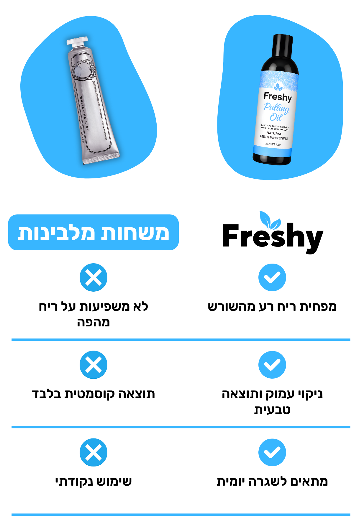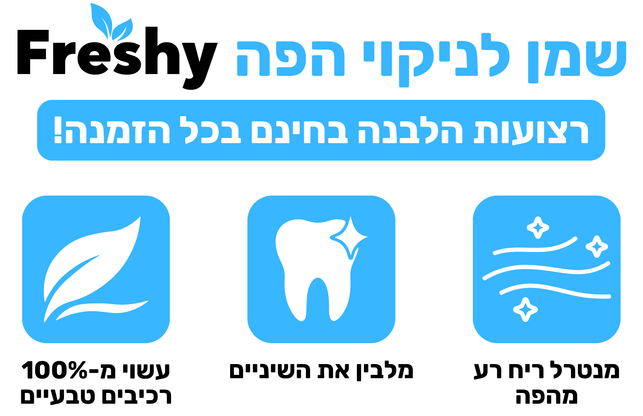 לא קניתי את Freshy בשביל הלבנה, יותר בשביל הריח מהפה.אבל אחרי כשבועיים שמתי לב שהשיניים נראות נקיות ובהירות יותר, בלי רגישות ובלי צריבה.הייתי סקפטי לגבי משיכת שמן, אבל זה הרבה יותר עדין ממשחות מלבינות, והנשימה גם נשארת רעננה לאורך זמן.